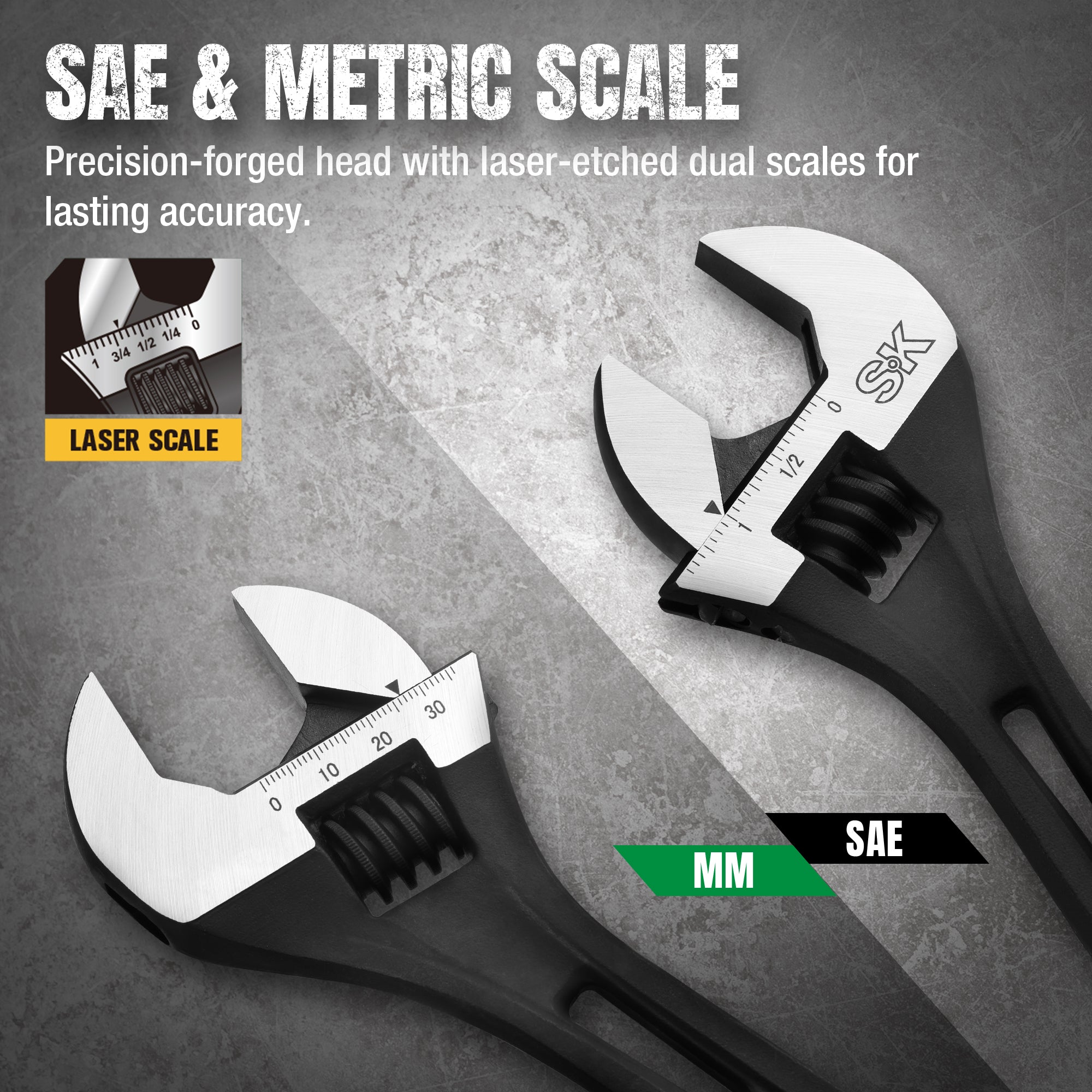 • SAE & Metric markings provide quick size reference.